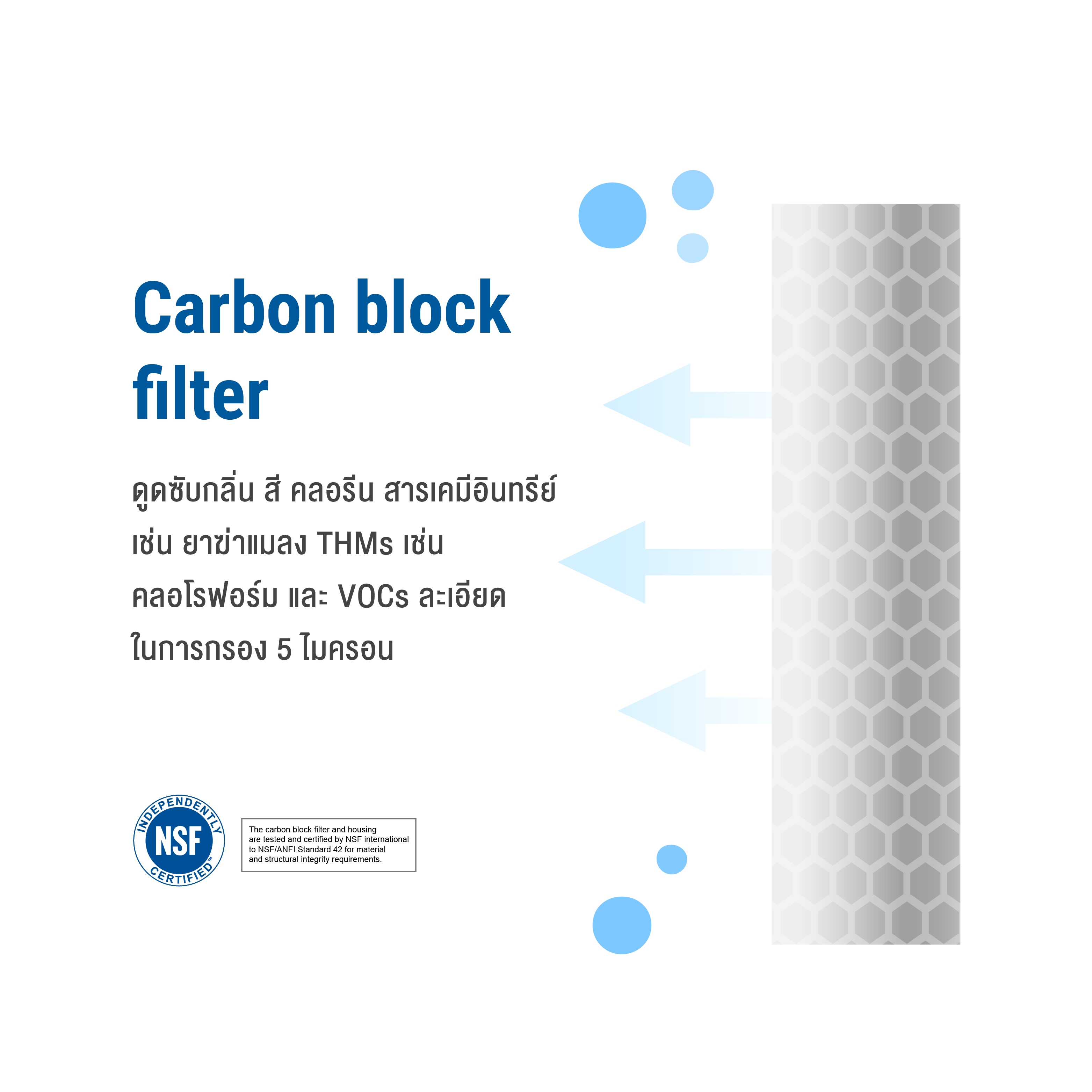 ● ระบบการกรอง Carbon block filter : ดูดซับกลิ่น สี คลอรีน สารเคมีอินทรีย์ เช่น ยาฆ่าแมลง THMs เช่น คลอโรฟอร์ม และ VOCs ละเอียดในการกรอง 5 ไมครอน